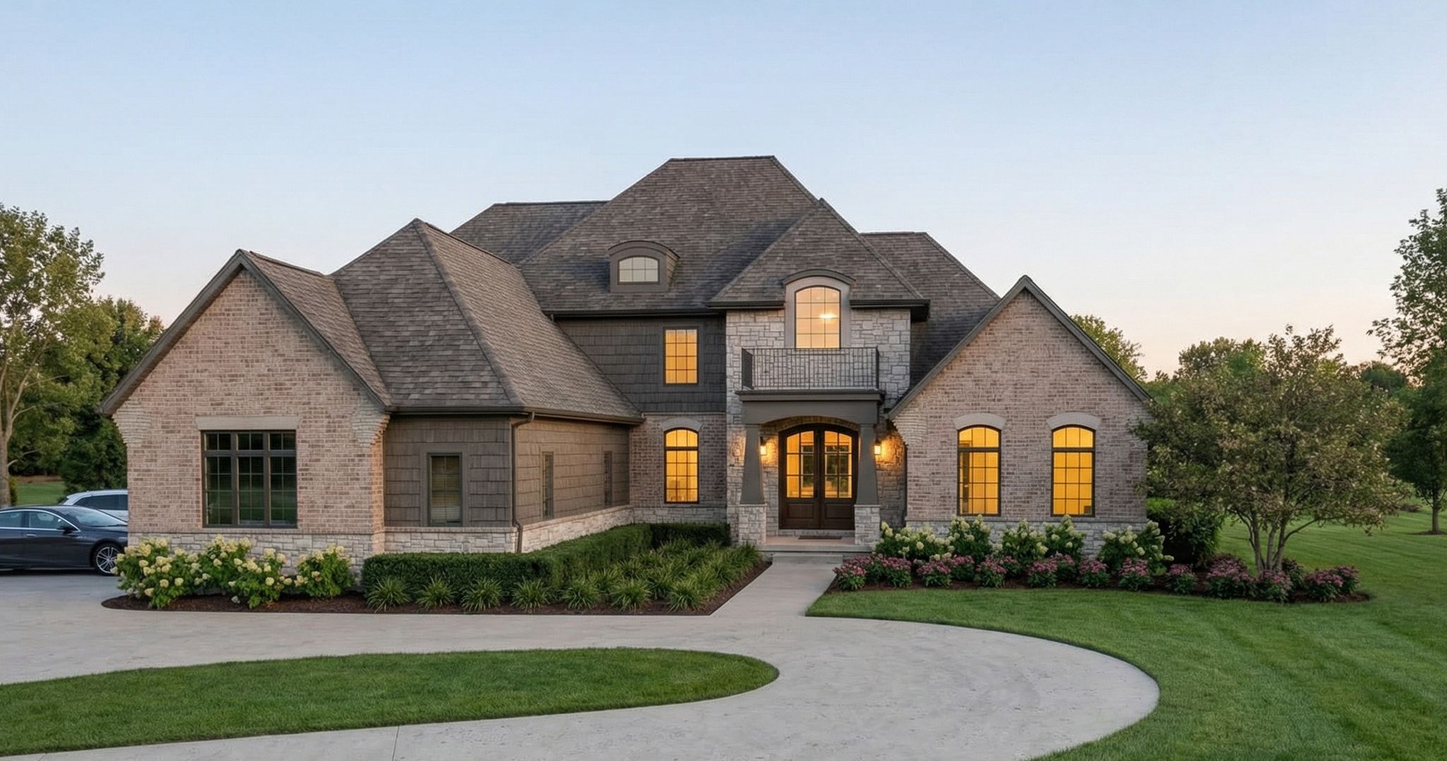 A full‑brick exterior with stone accents and striking iron double doors